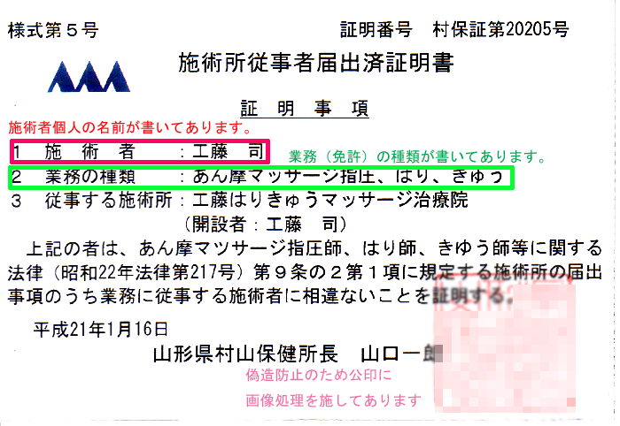 なお、免許を持った施術者は保健所から施術者名が書かれた証明書(IDカード大)を発行してもらえます。